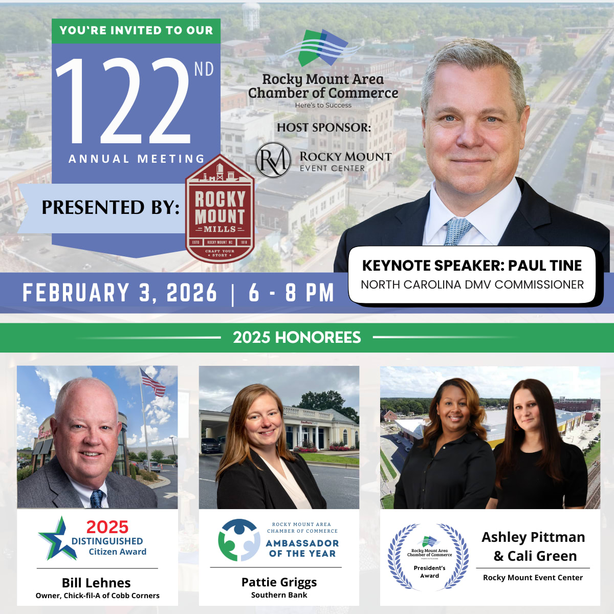 We are proud to honor Bill Lehnes as our 2025 Distinguished Citizen of the Year. We will also recognize Pattie Griggs of Southern Bank as 2025 Ambassador of the Year, present the President’s Award to Ashley Pittman and Cali Green of the Rocky Mount Event Center, and welcome our keynote speaker, Paul Tine, Commissioner of the North Carolina Division of Motor Vehicles.