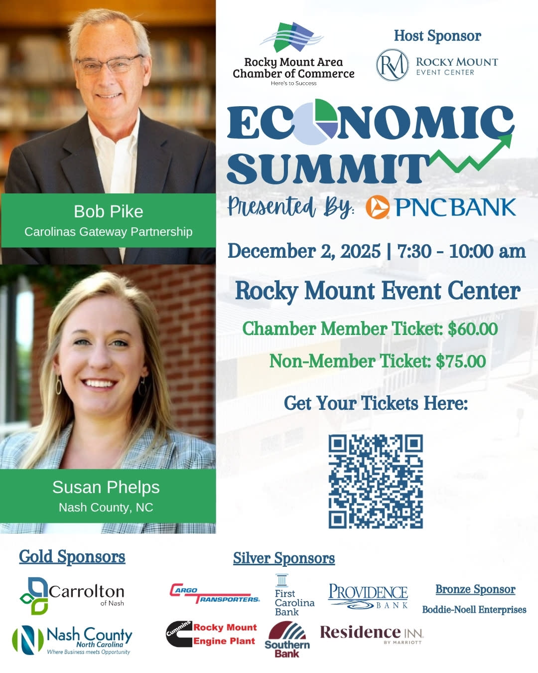 Join us on December 2, from 7:30 to 10 AM at the Rocky Mount Event Center for an engaging discussion on local, regional, and national economic activities, trends, and expectations. Our Chamber Economic Summit provides valuable insights to guide your business and community forward.