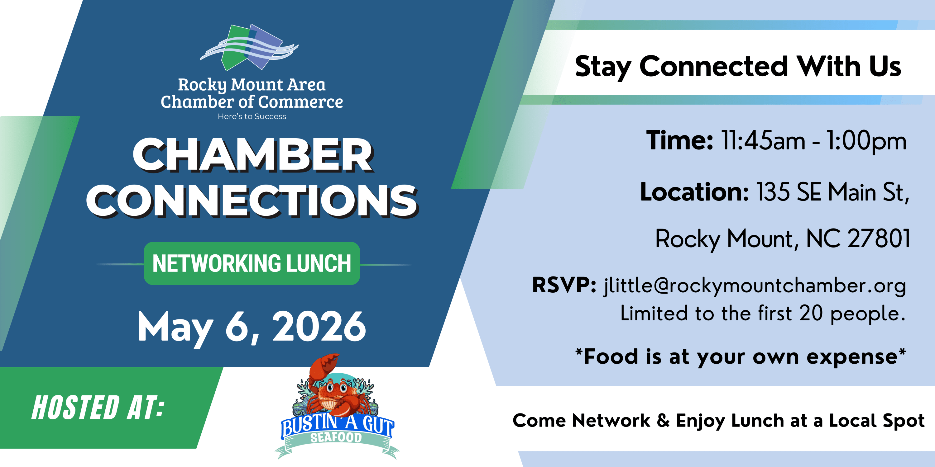 Join us for our Chamber Connections lunch on May 6th from 11:45 AM to 1:00 PM, at Bustin' A Gut Maryland Style Seafood, 135 SE Main St, Rocky Mount, NC 27801. Spots are limited to the first 20 people, so don't wait! Food is at your own expense!