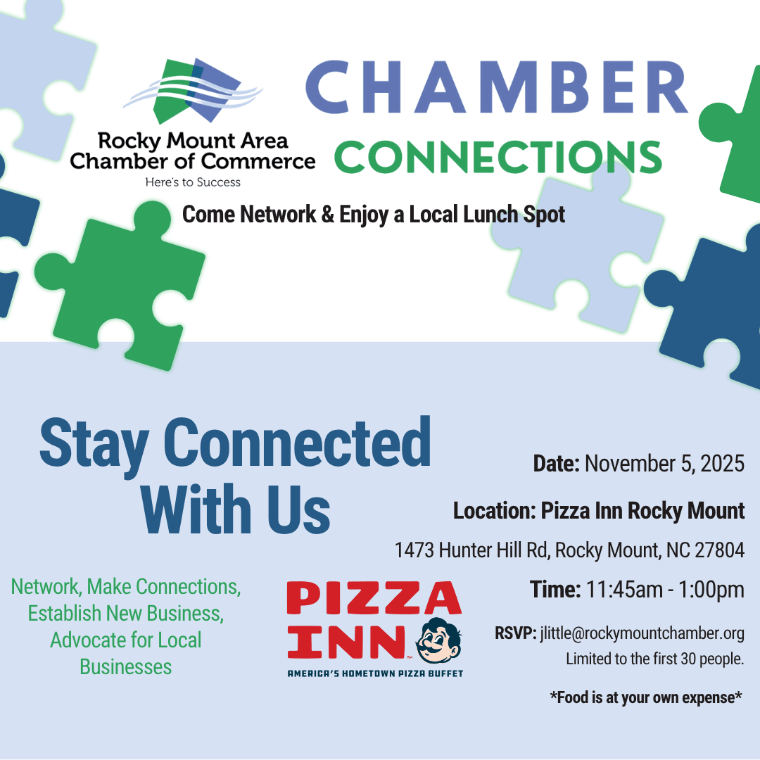 Join us for our monthly Chamber Connections on November 5,2025, at Pizza Inn! From 11:45 am to 1:00 pm, at 1473 Hunter Hill Rd, Rocky Mount, NC 27804 . Network, Make Connections, Establish New Business, Advocate for Local Businesses. *Food is at your own expense.*