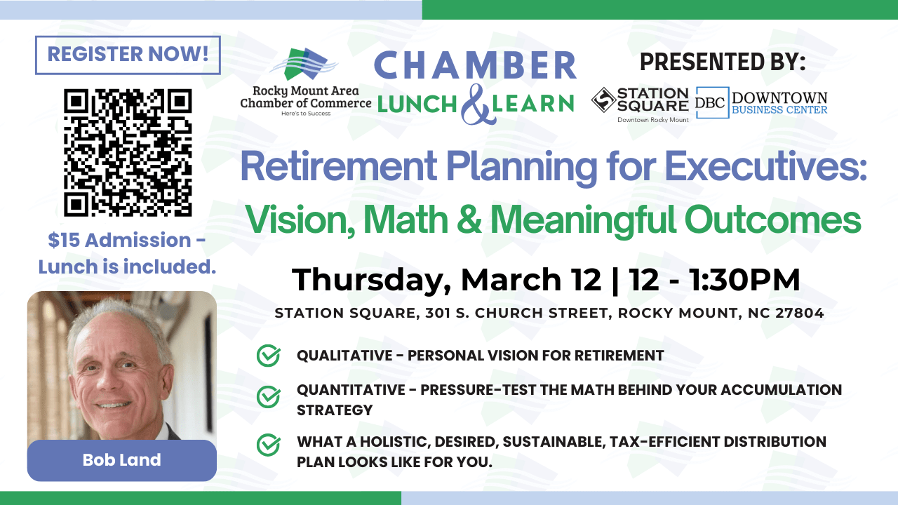 Join us for an informative Lunch & Learn on Retirement Planning for Executives with Bob Land of Landmark Financial Services. This focused session is designed to help professionals, business owners, and leaders take a proactive step toward a confident and sustainable retirement.