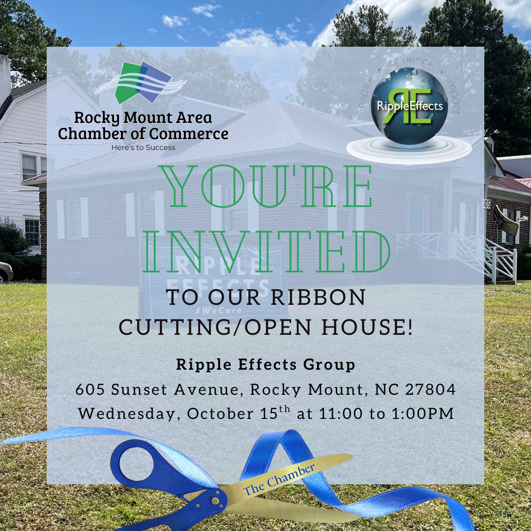 Ripple Effects Group, with the Rocky Mount Area Chamber of Commerce , is officially cutting the ribbon and opening our doors at our newest location for a special celebration on Wednesday, October 15. Ribbon Cutting Ceremony: 11 AM – 1 PM