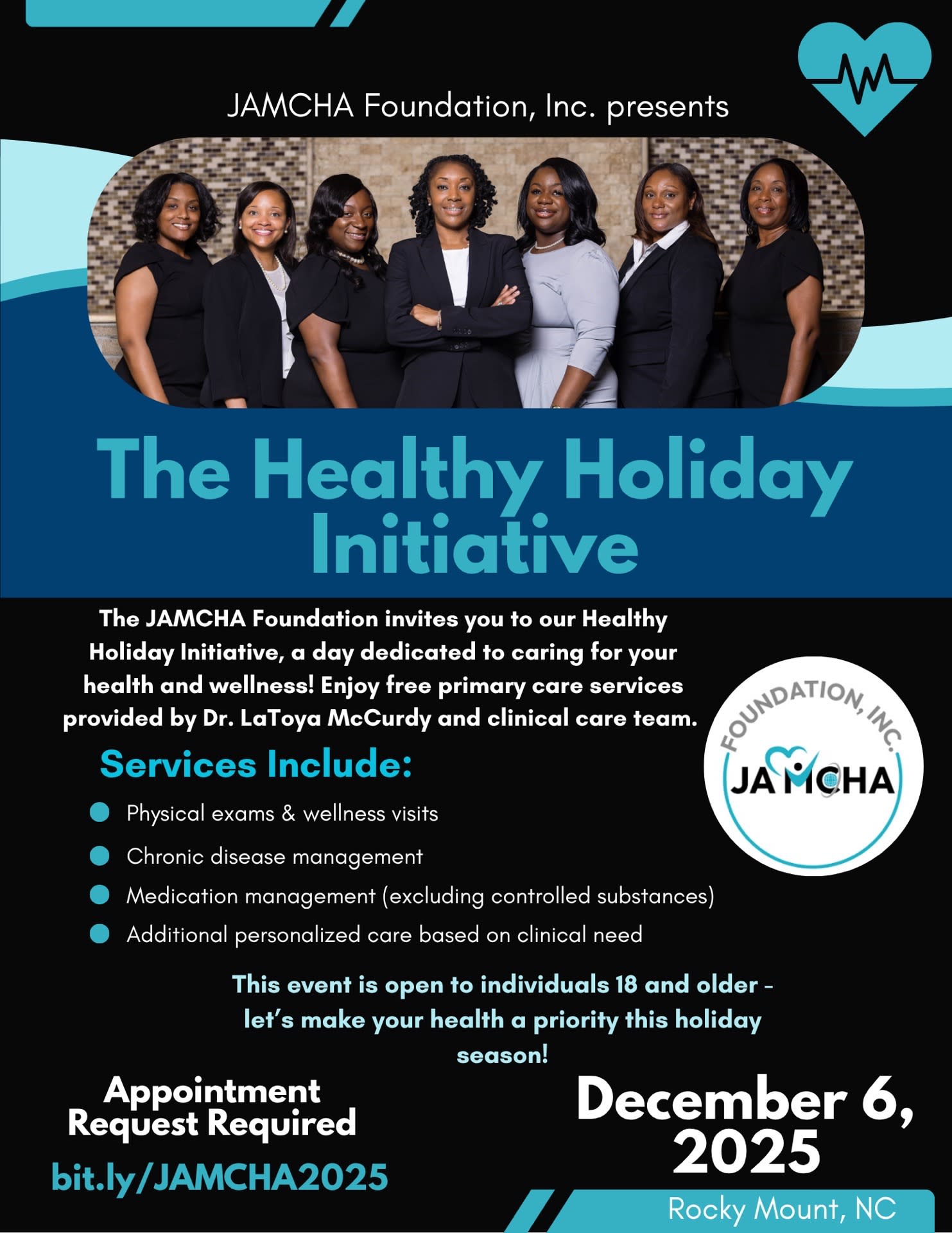 Rocky Mount, NC — JAMCHA Foundation, Inc., a 501(c)(3) nonprofit dedicated to advancing health equity, improving health literacy, and empowering underserved communities, announces its inaugural community health initiative, Healthy Holiday by JAMCHA Foundation, scheduled for Saturday, December 6th in Rocky Mount, North Carolina.