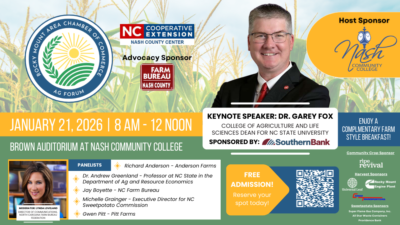 ROCKY MOUNT, NC — At a time when farmers and agribusinesses are facing rising costs, policy uncertainty, and mounting pressure on food systems, the Rocky Mount Area Chamber of Commerce will convene leaders from across North Carolina agriculture for its 2026 Agriculture Forum on Wednesday, January 21, 2026, from 8:00 AM to 12:00 PM at the Brown Auditorium at Nash Community College.