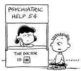Snoopy standing on Linus’s security blanket Lucy giving advice at the Psychiatric Booth.